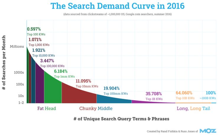 長尾關鍵字字數確實很多,但也在前一千萬個搜尋問題之外佔了很大的數量;實際上,近乎25%的搜尋量是在前一億個關鍵字之外進行。